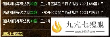 2、测试等级奖励,测试区达到相应等级,可领取以下奖励(每个账号只能领一次),截止时间为开区当天11:00。