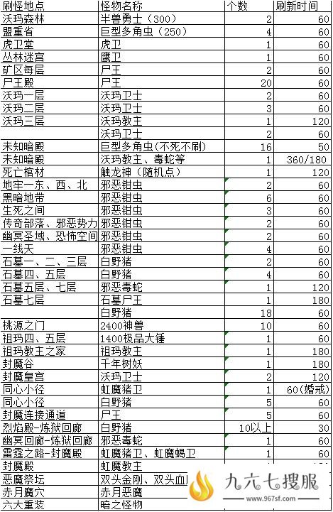 怪物刷新时间按死亡时间,不死不刷。僵尸开始爆出26级以下技能,蜈蚣起爆出祝福油,尸王、白猪、神兽、石墓尸王、极品祖玛、血巨人等爆高级技能,赤月小怪爆疗伤药,六大神水主要BOSS爆,罗刹靠变异骷髅,神兽,半兽统领。终极装备要去赤 月,双头金刚出法神、龙牙。双头血魔出圣战、怒斩。赤月恶魔出天尊,逍遥扇。血僵尸出血饮。虹魔教主出魔血装备,虹魔蝎卫、猪卫出虹魔装备。挖矿要在废矿区入口,熟记BOSS刷新时间表,夺宝先锋就是你。