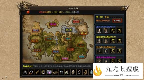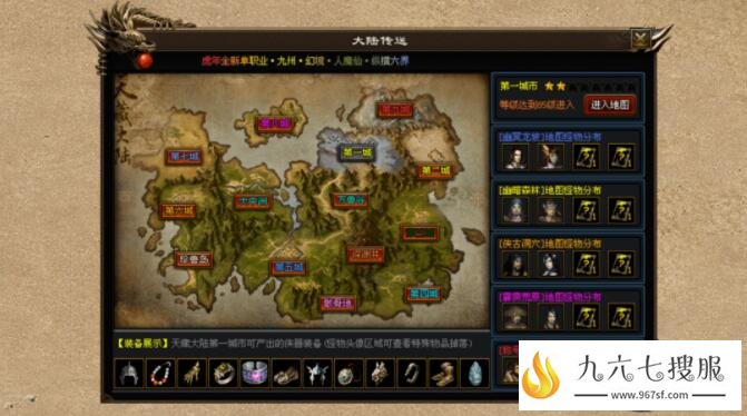 九州大陆,每个城市都可以掉落对应的兵器图谱,图谱可制作兵器,提高颜值和属性,越高级的兵器属性加成越好;